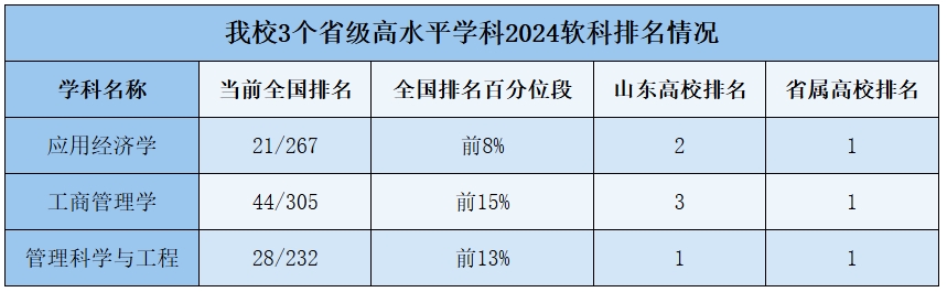 近年来,学校坚持以学科建设为龙头,主动对接国家战略和区域经济发展,坚持教育、科技、人才三位一体统筹推进,不断强化高水平学科建设和质量提升,在人才培养、学科平台、重大奖项等方面取得显著成效,学科综合实力显著提升。学校3个山东省高水平学科(应用经济学、工商管理学、管理科学与工程),在2024软科中国最好学科排名中均列省属高校第一位,其中管理科学与工程学科列山东高校第一位。